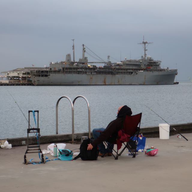 17 July: USS Emory S land AS 39 at Station Pier. Fishing continues in all weathers.