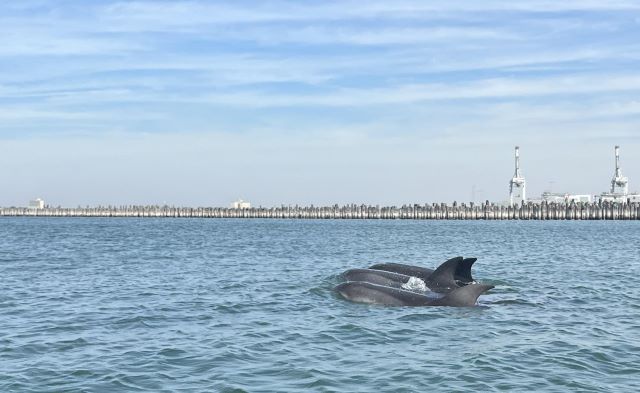 Dolphins and a seal are observed off Princes Pier, Port Melbourne.
