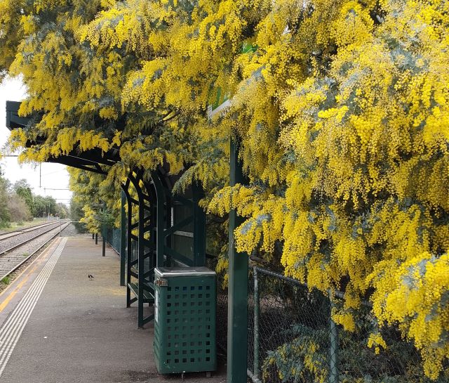 Cootamundra wattle enveloped North Port tram stop and turned the Railway Reserve between Bridge and Raglan Sts golden.