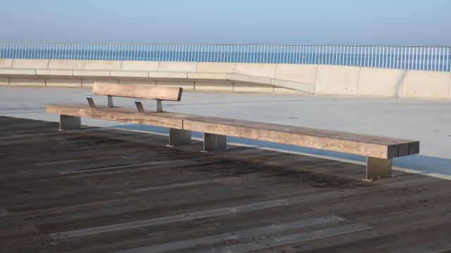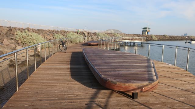 Sixteen new bench seats made of timber recovered from the old St Kilda Pier are positioned to make the most of the view back towards the city.