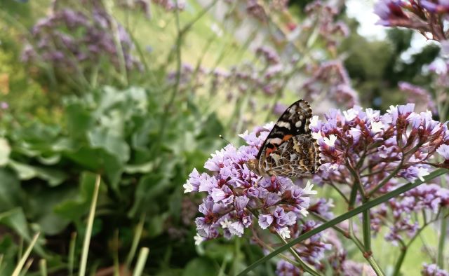 Even in the extreme heat, the flowers were alive with European honey bees Apis mellifera. Since they are so abundant, the observation task is now to look for anything that is not a European honey bee. That is when we saw the Australian Painted Lady butterfly.