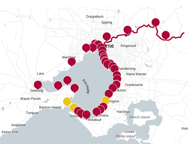 The Bay and its beaches cop whatever comes down the River. EPA Beach Report strongly recommends not swimming in the Bay after rain, especially near stormwater drains. Red denotes poor water quality, not only on Bay beaches, but also at Warrandyte, Launching Place and Healesville.