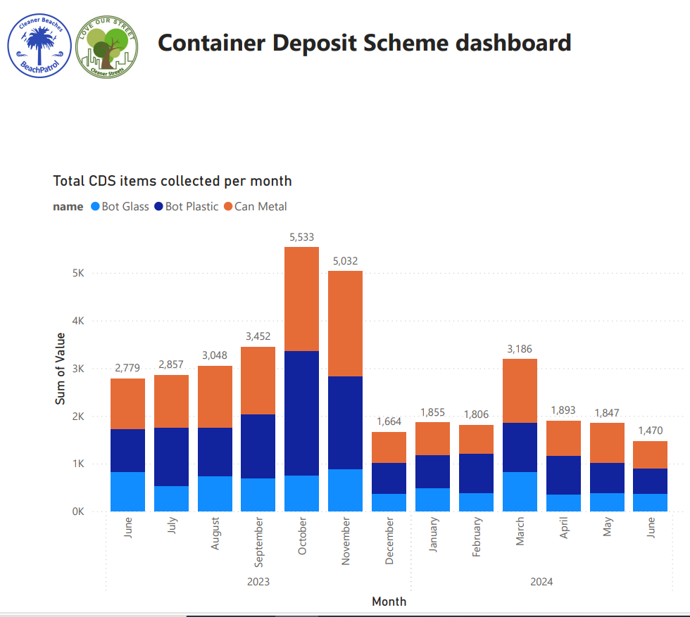 Dr Ross Headifen has been tracking litter data from 3207 Beach Patrol and 3207 Love our Streets monthly cleans for many years now. We can be confident of his observations on the impact of the introduction of the CDS. From a peak of 5533 containers collected in October 2023, the number reduced to 1479 in June 2024.