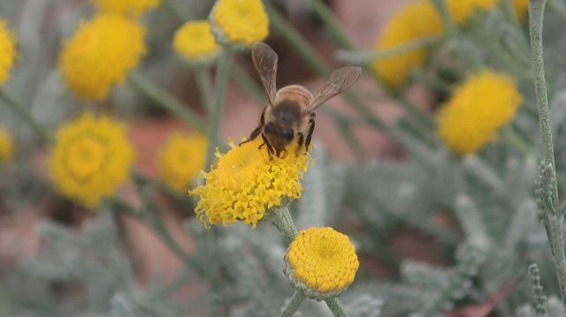 Back to the Santolina. It is very attractive to bees. European honey bees, Apis mellifera, that is.