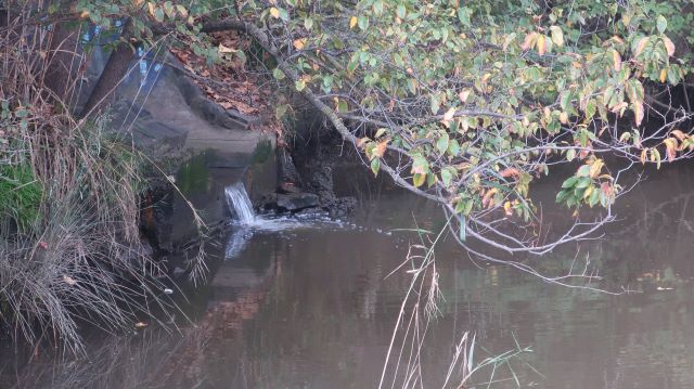 A pied cormorant on alert. Strands of stormwater borne plastic caught in the twigs. A Nankeen night heron under the cover of branches watching the water intently. Stormwater drains flowing into the River like a water feature.