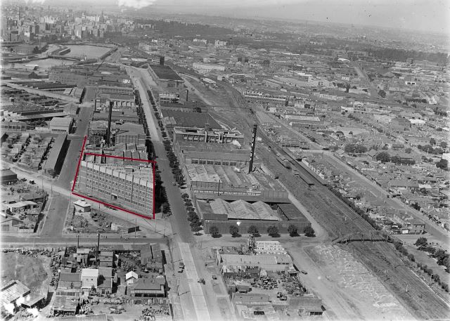 I always hoped for an exceptional response to this unique site (highlighted in the photograph below) after seeing this photograph by Graeme Butler taken for the South Bank Conservation study in 1982. The site was part of the former Dunlops manufacturing complex which spanned both sides of Normanby Rd.