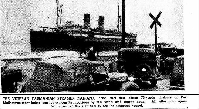 On Sunday 18 February 1951, winds of 73 mph (117 kph) drove the SS Nairana aground from her mooring in Hobsons Bay. She came to rest on the beach at the end of Beacon Road. It was an ignominious end to a ship that had seen service in the First World War at Archangel and served faithfully between Tasmania and the mainland.